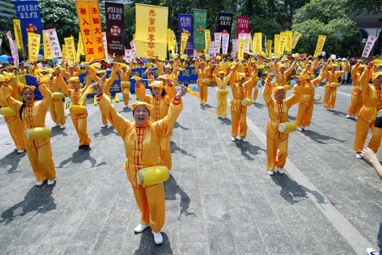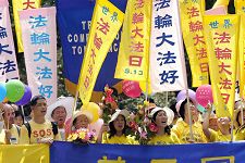![]() 学员张起横幅与幡旗,欢庆世界法轮大法日。 | ![]() 腰鼓表演,恭贺师尊华诞。 |