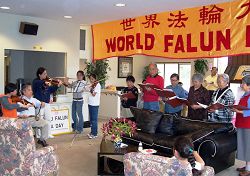 午间,大家分享了学员们为庆贺师尊五十五华诞而准备的生日蛋糕和丰盛的菜肴。此间“老少乐队”的乐器合奏出台了,演奏了歌曲“请与我比邻而坐”。尔后,老年合唱团分别用中、英文唱了这支歌曲。最后大家一起合唱了“法轮大法好”。