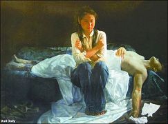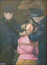 在雅芳图书馆举办的中国艺术展展出了许多幅描绘中共迫害法轮功修炼者的作品。五月份到雅芳(Avon)公共图书馆参观画展的人们可能会感到困惑。在展厅的一面墙上挂着的中国艺术家们创作的作品中,描述了在入静打坐中的平和的人们,而在另一面墙上的作品中,则描述了人们在遭受酷刑折磨。