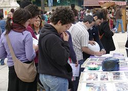 ![]() 在世界地球日集会上,学员们向西班牙人介绍大法和讲真相 |
