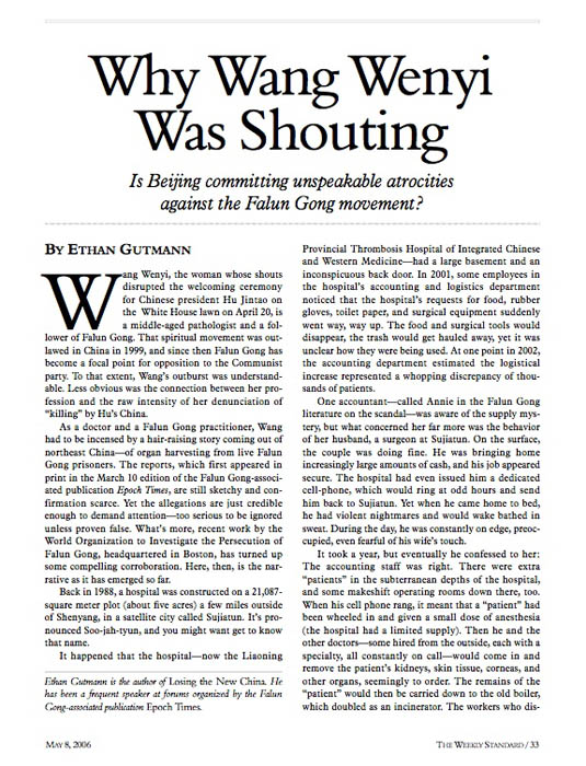 【明慧网2006年5月2日】(明慧记者刘东编译报导)《旗帜周刊》(Weekly Standard)在5月8日的第32期期刊上刊登《失去新中国》一书作者葛特曼(Ethan Gutmann)的文章,探讨王文怡白宫抗议的背景和中共是否在摘取法轮功学员的器官。葛特曼认为,王文怡的抗议起因于一则来自中国东北的令人毛骨悚然的报导:中共活摘法轮功学员的器官。