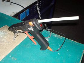 4. 买一台用于纸盒包装的热熔胶枪(见图),插入胶棒,预热约10分钟。书压紧后,首先用热熔胶枪往孔内(应注满)和铁片套上注胶。待孔内的胶基本固化后,再往书的侧面涂上薄薄的一层胶。