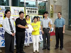![]() 法轮功学员向蔡文旭傅大伟两位议员递交陈情书 | ![]() 法轮功学员在嘉义市议会举展板 谴责中共暴行 |