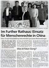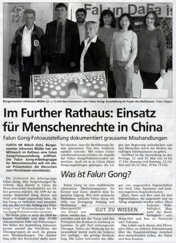 图片展开幕后第二天,“拜恩森林回响报”(Bayerwald Echo)也刊登了报导,题为“福特市政府:为中国人权努力/ 法轮功图片展纪录残忍的虐待”。 报导中写到,福特市长尤汉纳斯·穆勒(Johannes Mueller)为法轮功图片展揭幕。法轮功人权工作小组希望通过图片让人们去观察(真相)。
