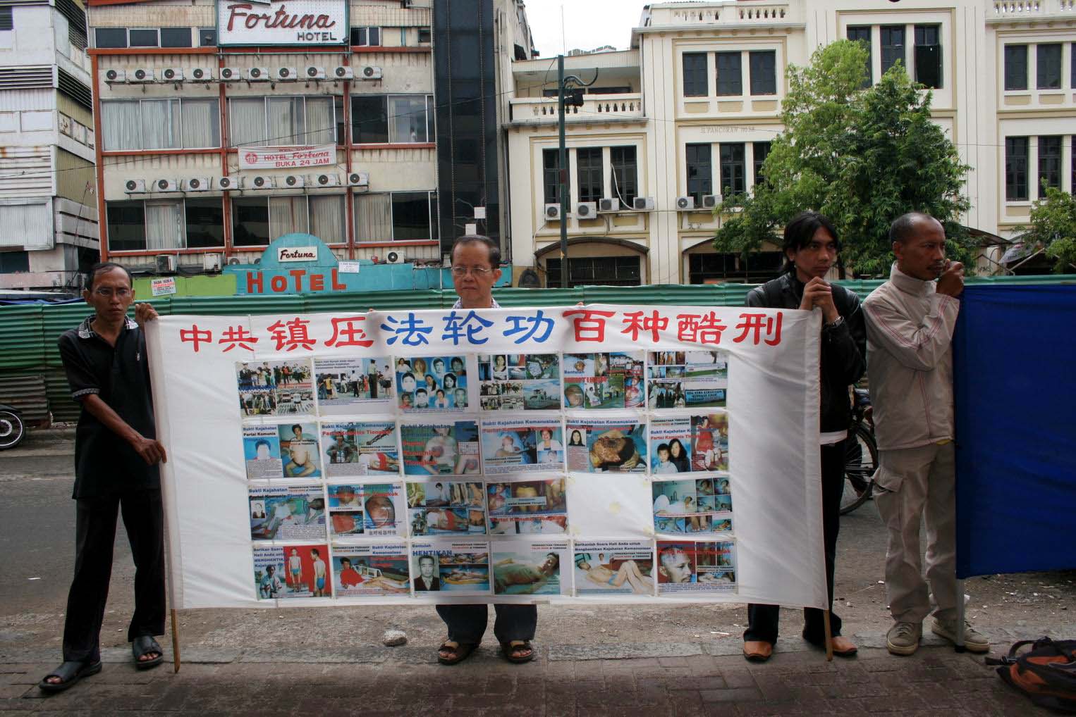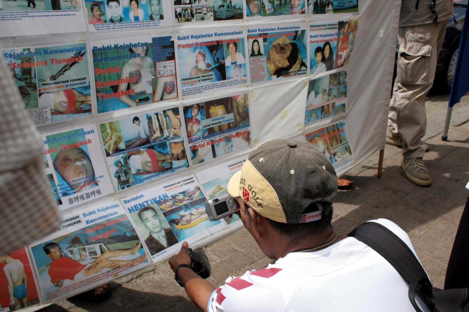 一位华裔男士说是来自苏拉威西,他说他看了横幅和照片,首次知道法轮功被中共迫害的那么悲惨,说话时流露遗憾的神情。