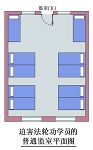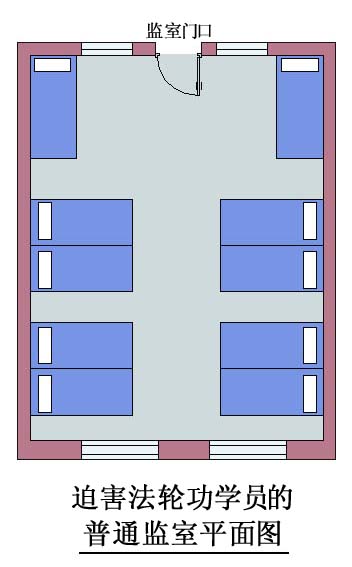 图二:女二所普通监室平面图。每个监室有10个床位、上下铺,共20个铺位。一大队每个监室门口的玻璃,都被恶警用不透明塑料膜粘上,只留一个小眼,供警察从外面用一只眼窥探。监室的后墙上有挂钟式监视器,外表看起来是一个电子挂钟,摄像头隐蔽在挂钟12点的位置。2005年末,又在监室门上方安装了另一个监视器。恶警把法轮功学员铐在监室内的铁床栏杆上折磨,绝食抗议的学员们被六七个恶警拖到监室的地上,粗暴灌食。