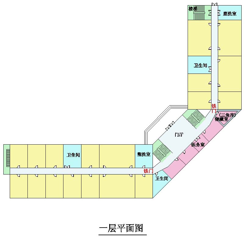图三:女二所一楼平面图,淡黄色区域为迫害法轮功学员的场所。一楼两侧铁门里的房间专门迫害法轮功学员,学员被铐在铁床上,被狱医曹玉杰、陈兵等恶警强制扎针、灌食。狱医曹玉杰等作恶心虚,对外称“暴力灌食”为“喂饭”。这里还有“死人床酷刑,女二所恶警所长苏境对外叫“特别护理”。法轮功学员全身连续一个月或几个月被绑在铁床上,大小便也不许起床。2005年,大连法轮功学员姜桂云被绑“死人床”5个月零10天,鞍山法轮功学员滕世云被绑“死人床”一个多月。大连法轮功学员狄丽等均遭到绑“死人床”折磨。