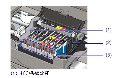 b. 将内墨盒装在墨车上,各墨盒安在各色墨盒的指定位置,所有墨盒位置平齐,这时,所有墨盒的红色指示灯应处于亮起状态,注意:将输墨管线从打印头锁定杆的下面穿过;
