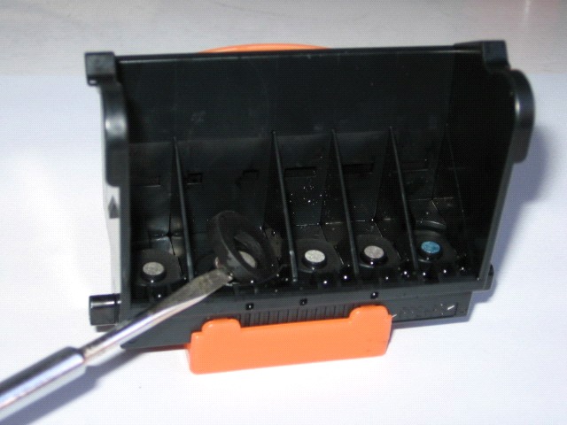 c.用小螺丝刀将打印头的“喷嘴进墨管”上硅胶垫圈逐一撬下;