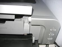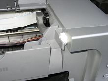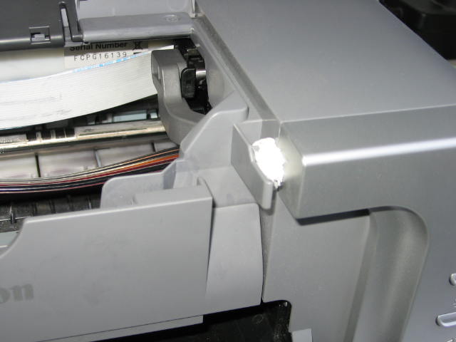 d. 用卫生纸将微动感应开关塞住(该开关是个小按键销,位于前机盖的右前部,平时被机盖所覆盖),这时墨车归位;