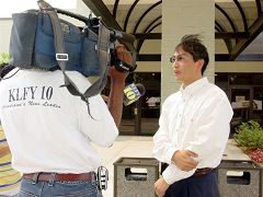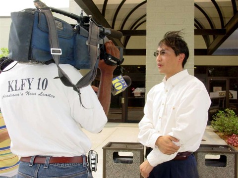 ![]() KLFY第10频道电视台记者在法轮功新闻发布会做现场采访 |