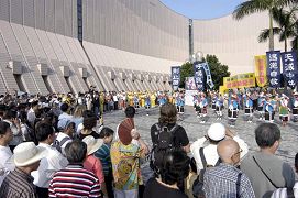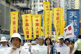 ![]() 在香港文化中心外声援退党 | ![]() 旗鼓队在著名的五支旗杆下声援千万人退党 |