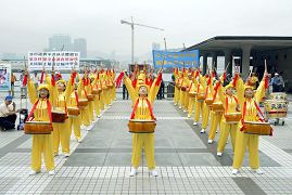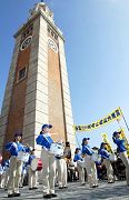 ![]() 法轮功学员捧着悼念死难学员的花环,在香港立法会旁走过。 | ![]() 天国乐团在尖沙咀钟楼前表演 |