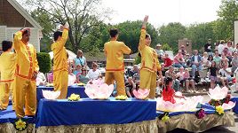 学员们手工制作的“法轮大法”横幅、以莲花和横幅装扮的造型清新雅致的花车、“缓、慢、圆”的法轮功功法演示、唐装舞蹈等等,使法轮功学员的队伍在一百多个团体构成的大游行中独具一格。除了报以热烈的掌声,很多人还模仿着花车上功法演示的动作,也有的观众特意跑到队伍中,向学员了解更多关于法轮功的信息。