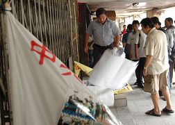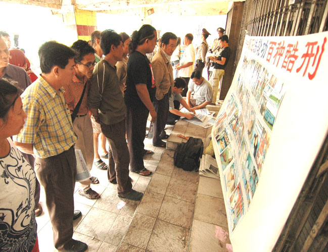 法轮功学员刚到活动地点,展示用具还没完全摆好,资料尚在整理中,即有多人索取,不到数分钟,索取资料的人潮出现拥挤情形,小小的展示点竟挤满了近百人,拿资料的,看标语的,读横幅的,当人们拿到了资料阅读后,都表示非常震惊。