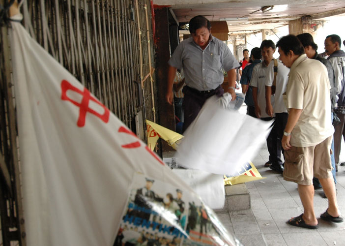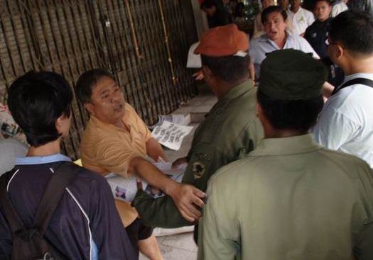 5月6日,充当中共打手的“华社人士”粗暴的撕破横幅、传单,嚣张大骂