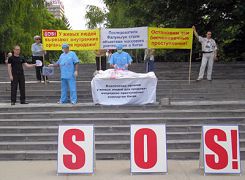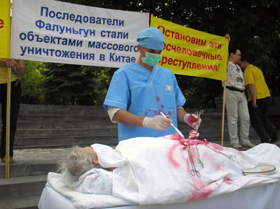 ![]() 三个横幅写着:紧急呼吁制止这种反人类的罪行!在中国有大批法轮功学员被虐杀! | ![]() 模拟演示中共从法轮功学员身上摘取活体器官贩卖 |