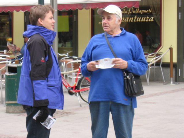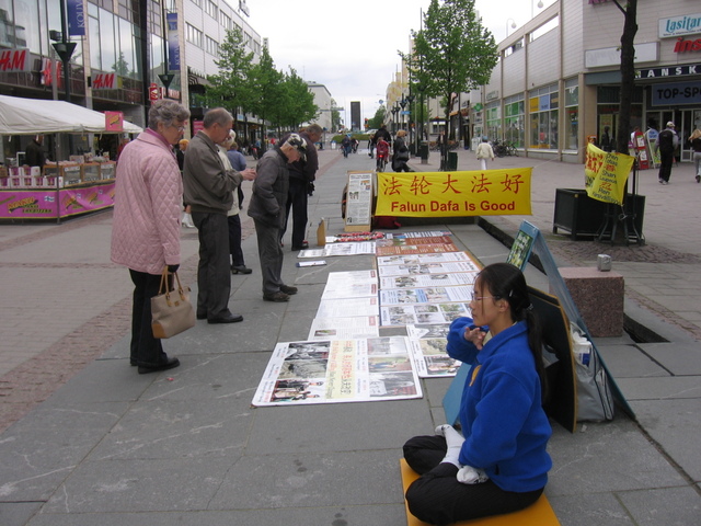 在图片展旁,也有学员展示祥和的功法,一位男士被深深的吸引了,当场请了《转法轮》书和所有资料,并要求学习功法,经与学员商定,下周三学员将来高沃拉办班教功。这位芬兰人高兴的把好消息告诉了他的朋友们,他说下周三会有许多人来学。