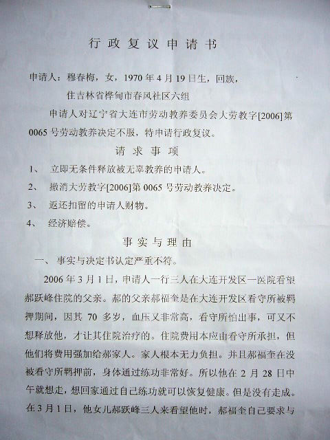 2006年5月8日,两家家属要求见穆春梅和刘明伟,办理复议申请书(要求无条件释放、并赔偿损失)的相关手续,需本人签名、按手印,他们再次来到马三家劳教所接见室。