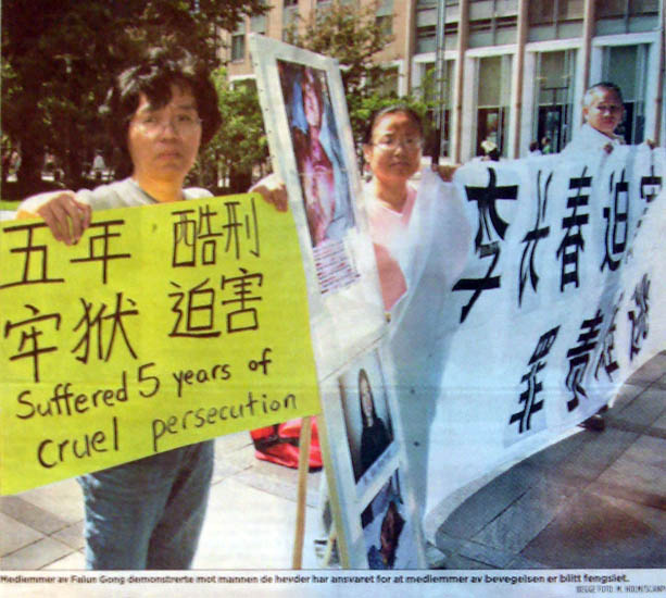 【明慧网2006年6月20日】中共政治局常委、前广东省省委书记李长春6月14日至19日在挪威访问期间,因其在对法轮功的迫害中犯有酷刑同谋罪,受到挪威法轮功学员的抗议。挪威晚邮报(Aftenposten)以“对中共高官无声的抗议”为题报道了法轮功学员的抗议活动。
