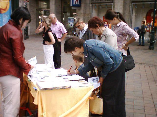 一位德国女士与她的同伴们在见到活动现场之后,径直走向学员们。她说,以前也看过这样的活动,收到了真相资料。当时,她对法轮功的情况不了解,所以并没在意就离开了。然而这次的相遇让她非常欣慰,因为在回去仔细看过那些资料之后,她觉的自己也应该为法轮功学员们做些什么。所以她告诉学员说,“这次我是特地来签名支持的。”之后她就在展板前给她的同伴讲解真相。