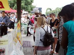 ![]() 观看法轮功真相展板的观众们 | ![]() 观看法轮功真相展板的观众们 |