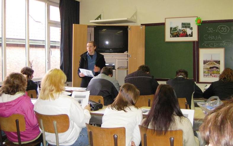 一位学员向师生们讲述了法轮功如何改变了她的生活,介绍了法轮功如何在中国兴起,然后迅速洪传,直至1999年迫害开始。中共迫害法轮功的真相在“黄色专递”演唱组《我希望人们能够自由》的歌声中进一步讲述着,看着英文的歌词并由学员将其详细的翻译成荷兰语后,学生们能够明白这首歌的含义。之后学员读了一篇揭露中共迫害法轮功学员并活摘器官的文章。一个学生听后感到特别的不安,他不能理解人怎么可以这样对待他人。
