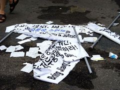![]() 躲入中领馆的肇事者终被逮捕判罪 | ![]() 被肇事者撕毁的横幅 |
