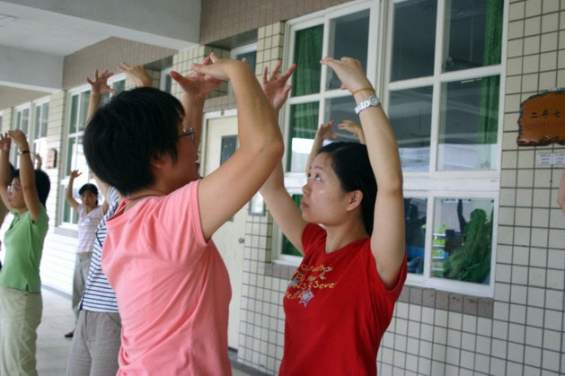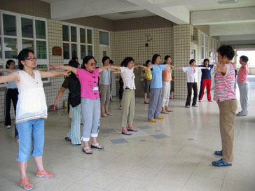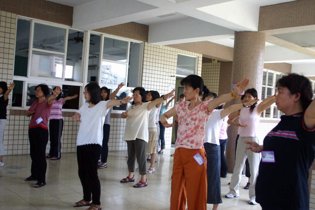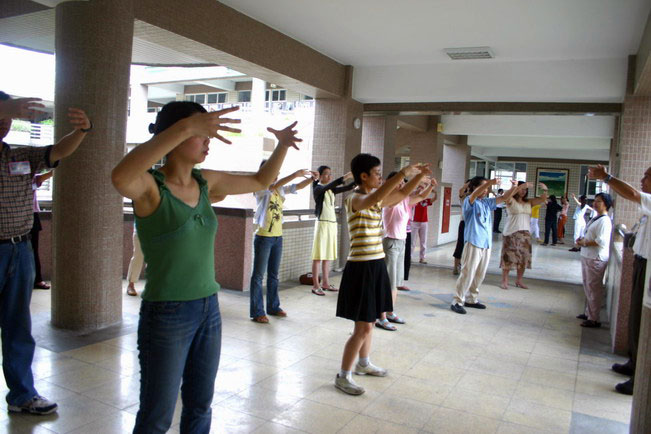 活动当天还安排教功,虽然天气酷热,但教师们认真学炼、法轮功学员们热心的教功,为酷暑增加一份沁人心脾的祥和画面。此外,当天活动结束前20分钟,还安排不同年龄层的法轮功学员上台分享修炼心得,他们以生活的实例分享如何以真善忍为指导,修去名利情等执著的过程,让与会的老师朋友们对法轮功有更深一层的认识及了解,很多教师表示,明天一定还要来参加!