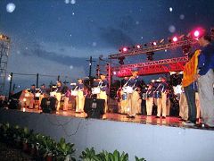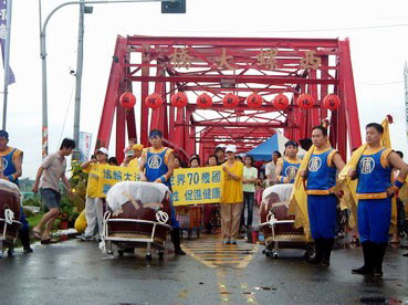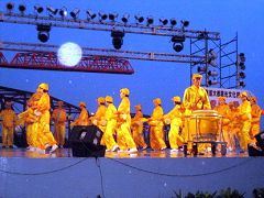 7月9日傍晚,新唐人亚太电视台所属的新唐人旗鼓队登场亮相,这是由一群有志于传播美好华人文化的志工组成的队伍,于2004年成立。新唐人旗鼓队除了于2005年台北晚会公演之外,也于2005年2月在纽约林肯中心及华盛顿DC华纳剧场的第二届全球华人新年晚会上有盛大演出。新唐人旗鼓队撼动人心的鼓阵与壮阔舞动的旗海,呈现大唐盛世的气魄及华人艺术的独特魅力。旗鼓队的由来已久,自古以来,战争时就以飞舞的旗海、隆隆的鼓声震慑敌军,行进时更以大旗引导军队,以鼓声提振士气。而各种求神祈福的仪式里,也可见到旗鼓喧天,压镇万魔的阵势。鼓声可以激发人的心灵,而旗是一种引导。旗鼓队的表演,就是希望结合听觉与视觉,在一年一度云林的盛会中,为观众心灵带来美好的启发。