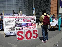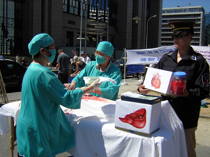 在欧盟理事会大楼和欧盟委员会大楼之间空地上,法轮功学员们搭起了中共迫害法轮功修炼者的大型展板,包括附有文字说明的法轮功学员经受酷刑致伤残的大型图片,以及近期曝光的中共强摘法轮功学员器官牟取暴利的反人类罪行的相关报道及图片。同时,一些学员真人模拟中共盗取法轮功学员器官及几种迫害酷刑。另一组学员做功法演示,和与中共的迫害形成鲜明对比。
