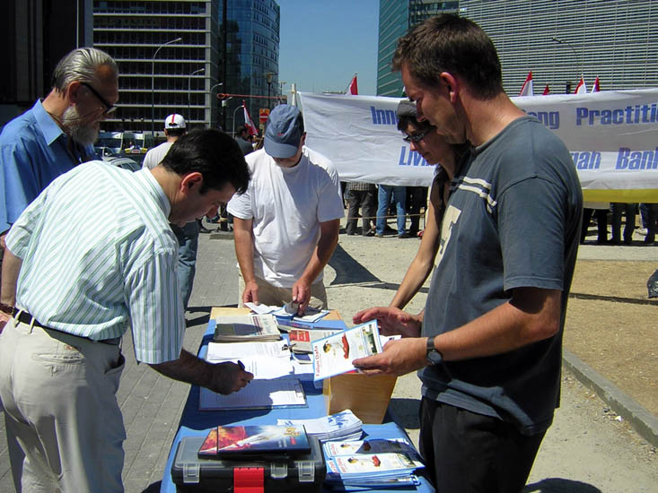 广场四周的欧盟各办公大楼里的工作人员频繁往来于法轮功学员的活动场地。今天的气温很高,许多人手遮强烈耀眼的阳光,驻足阅读展板上的文字与迫害图片。一些国家的媒体有的照相,有的来到学员的展桌前与法轮功学员交谈了解迫害真相并索取资料。当人们看到并了解了这些迫害真相后,纷纷走向请愿台前签名支持制止迫害。
