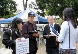 ![]() 揭露中共迫害法轮功修炼者的大型展板 | ![]() 民众纷纷签名支持制止迫害 |