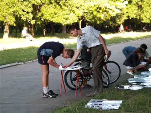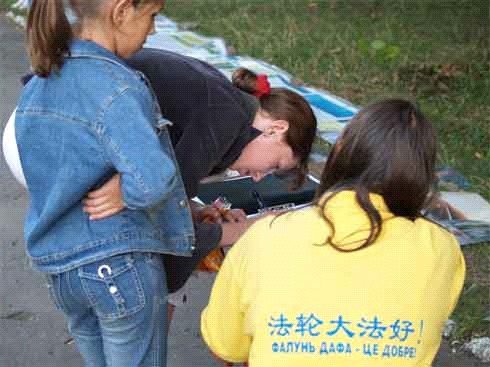 ![]() 在集会现场,民众学习法轮功 |