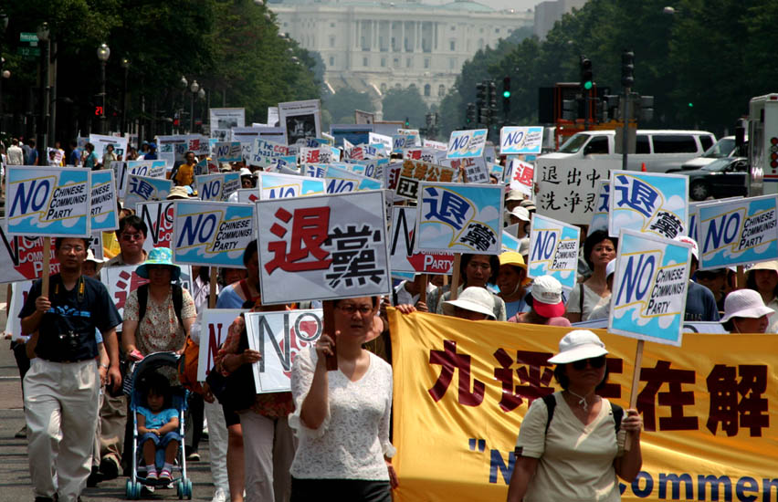 集会后,全球退党服务中心与100个团体主办了声援一千二百万中国人退出中共大游行。游行从美国白宫对面的拉菲叶广场出发,全程两英里,沿途经过美国政府机构、公司、律师事务所等办公楼。游行者手持横幅、展板向过往民众传递九评、退党和迫害的真相。