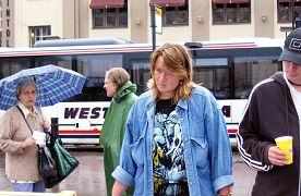 当天上午,天空中一直时断时续的飘着雨,几位模拟酷刑的学员衣服都淋透了,但演示依然在进行;很多观众没带雨具,却在雨中专注的看着学员的表演,了解着真相。