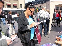 负责协调活动的法轮功学员李博士说,今天学员们配合的很有默契,但更使我惊讶的是民众的反响如此强烈,6个小时的活动我们发了大约3千份真相资料,前来签名声援反迫害的人不断,常常需要排队。