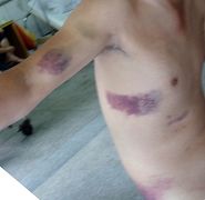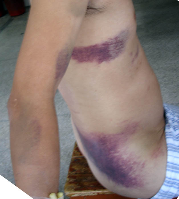 2006 年7月2日涌忠的父母接到监狱两次电话,要他们尽快赶到监狱。二老觉得不对劲,就和涌忠的一位朋友7月3日乘车到了监狱,可监狱的负责人说黄涌忠在医院;于是他们又赶到了医院。当他们找到涌忠时,只见他被手铐脚镣锁在病床上,已经不能说话,由一个犯人看管,母亲掀开被子,看到涌忠身上都是一块块的瘀伤。她责问监狱的人:“你们为什么把我儿子打成这样,你们还要锁他!”那人满脸堆笑的说:“我们这是文明单位,怎么会打他呢?这些伤是给他检查身体时,他不断挣扎造成的,这手铐也是怕给他打针时他要挣扎才给锁住的。”母亲气愤的反驳:“什么样的检查能让人挣扎的浑身青紫、瘀伤?连话都说不出来,动一下都很困难、甚至还要插上导尿管呢?”那人又狡辩说:“那是因为他的肝肾病毒已经扩散,才有那么多一片一片的青紫色的,他要得起病来谁有什么办法呀?”