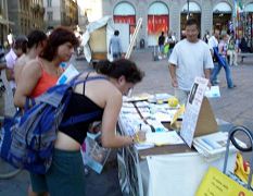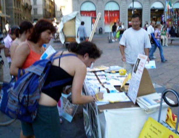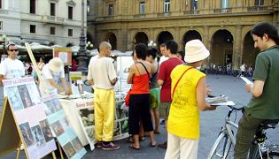 在佛罗伦萨中领馆前抗议的学员结束了上午的抗议活动后,又在40度的高温里在佛罗伦萨市中心的共和国广场举办活动,呼吁人们帮助结束在中国长达7年对法轮功学员的迫害,制止中共暴政。