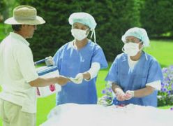 两名打扮成中国医生的男子在模拟摘取一名法轮功学员的器官