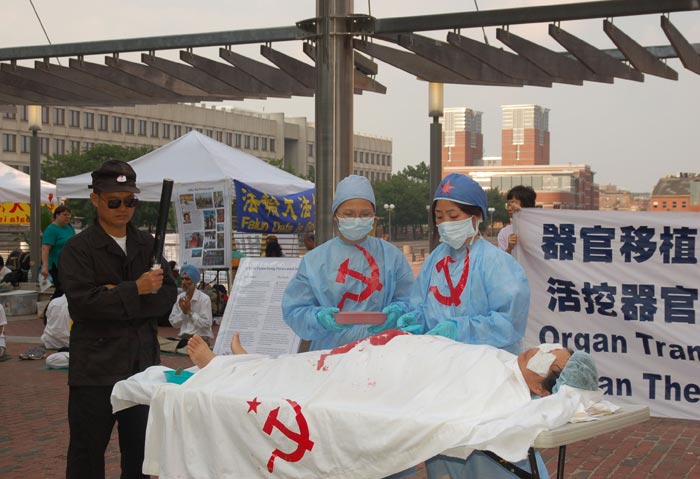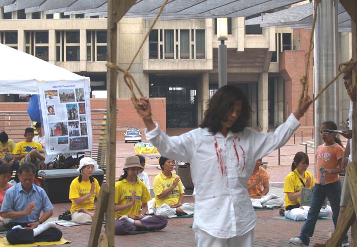 【明慧网2006年7月31日】据加拿大独立调查报告,中共大量从被非法监禁并判刑的法轮功学员身上活体摘取器官以获取经济利益。为了揭露中共活体摘取法轮功学员器官的残酷真相,约百名法轮功学员们于世界器官移植大会在波士顿召开期间,在波士顿市政厅前举办反酷刑展,呼吁美各个政府阶层都关注此事,立即制止中共的残酷迫害
