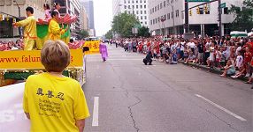 今年是法轮功学员第6次参加俄亥俄州首府哥伦布市独立日游行(该州最盛大的游行),法轮功学员一直是参与这一活动的唯一以亚裔为主的团体。鉴于在过去历届游行中的优秀表现,法轮功方阵在去年和今年都被游行组委会安排在了游行队伍的前列。花车上两个大法小弟子坐在莲花座上打坐的可爱模样吸引了很多孩子和他们父母的目光。