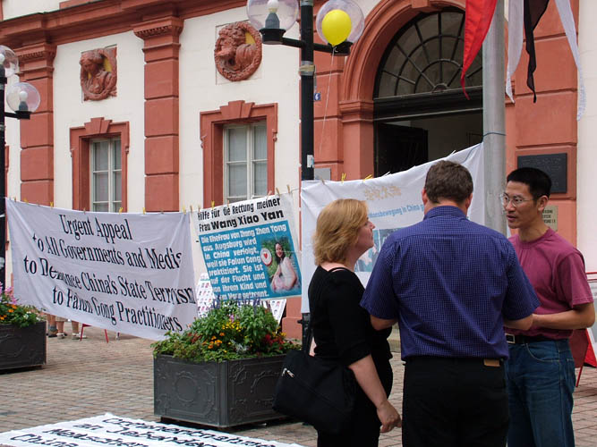 有人在仔细阅读了下午的传单内容后,在市政府为著名人士举行的晚宴散场时对学员说:“我已经全读了,谢谢你们,遗憾的是我们(以前)不知道这些信息。”当走出去10米远之后,那个德国人又回过头向学员大声说:“谢谢!谢谢!”