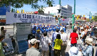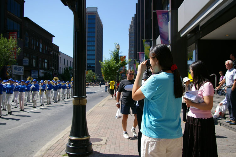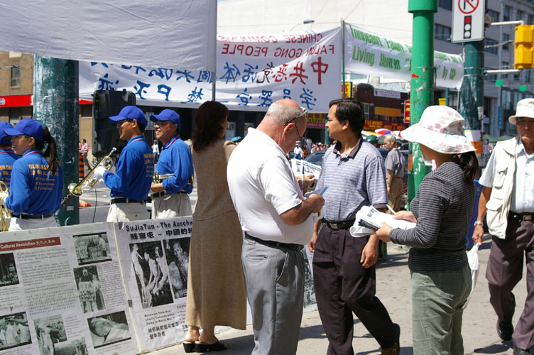 军乐队的演奏吸引了很多行人来了解真相,有人来签名呼吁加拿大政府帮助停止中共对法轮功的迫害,也有人来索取《九评》及其他真相资料。