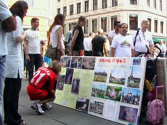 【明慧网2006年8月2日】挪威法轮功学员于2006年7月28日,在挪威首都奥斯陆市中心,以模拟演示的方式揭露中共活体摘取并出售法轮功学员器官的黑幕,呼吁挪威民众伸出援手,共同制止发生在中国的这种惨无人道的暴行。过往行人纷纷驻足观看演示,脸上流露出震惊的表情。明白真相的人们主动签名要求制止中共这一群体灭绝的罪恶。