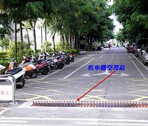 有一次,一个从外地来的学员,没注意到县政府出入口方向,清晨四点多天色还很暗,他从出口转进来,忽然觉的整个机车好象腾空被托起来,觉的奇怪也没多想。等炼完功天色已亮,循原方向出去时,才看到铁钩的地栅(如下图),直呼好险,是师父保护才没出危险。