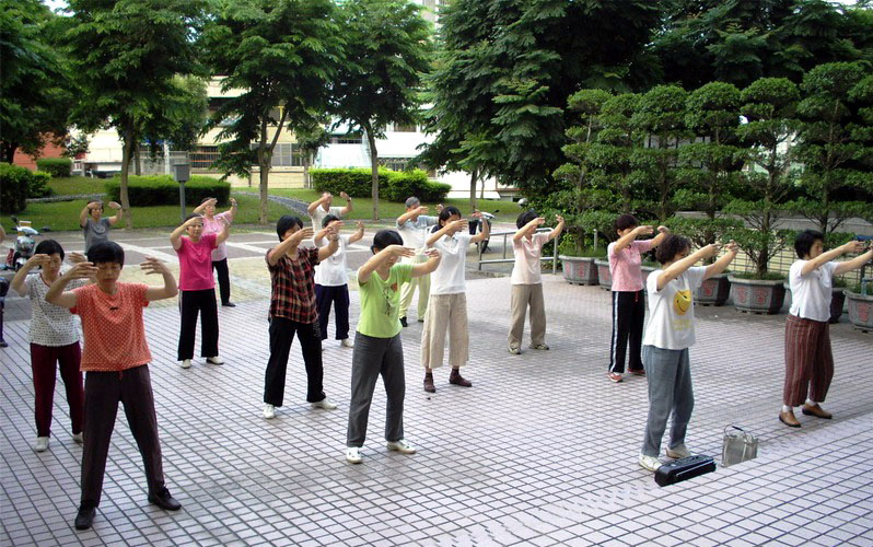 炼功都是自由的,来来去去有时多有时少,有银行职员、医生、老师、公务员、工人、家庭主妇……炼功空档,大家背《论语》或谈谈生活上修炼的心得。