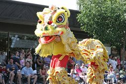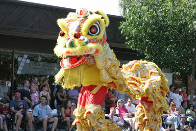 去年跳狮舞的白狮子给人幼稚天真的可爱印象。今年的金狮子则显得威武和气势不凡。它在游行途中不断的跳跃、上下摆动着灵活的脑袋,引来街道上观众们的阵阵兴奋和赞赏的掌声。