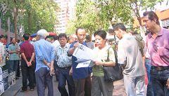虽然这样,我们还是坚持去中使馆,特别在李岚清访新那一个星期,横幅一拉上去,便衣马上就出现,我们只好把横幅收起来。有时,便衣早就在那里等我们,那一段时间,我们几乎没有挂横幅,直到7月12日,警察把我们拘捕,并警告我不能再去中使馆。但到7月20日,我还是依然到中使馆去,他们再一次拘捕我。