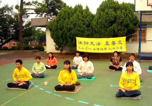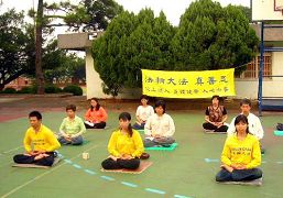 侨善国小的炼功点,不管刮风下雨、酷热严寒,除非是大台风天,都可见法轮功学员炼功身影,从早上4:20~6:10.平时在篮球场上炼功,下雨时到司令台。